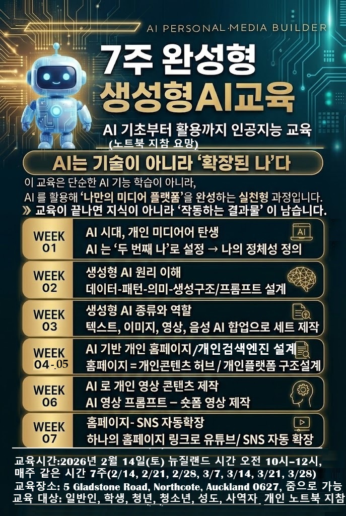 개강 2026년 2월 14일(토) 뉴질랜드 시간 오전 10시-12시, 줌 시간 한국시간 2월 14 토요일 오전 6시-8시 매주 같은 시간 7주 (2/14, 2/21, 2/28, 3/7, 3/14, 3/21, 3/28)