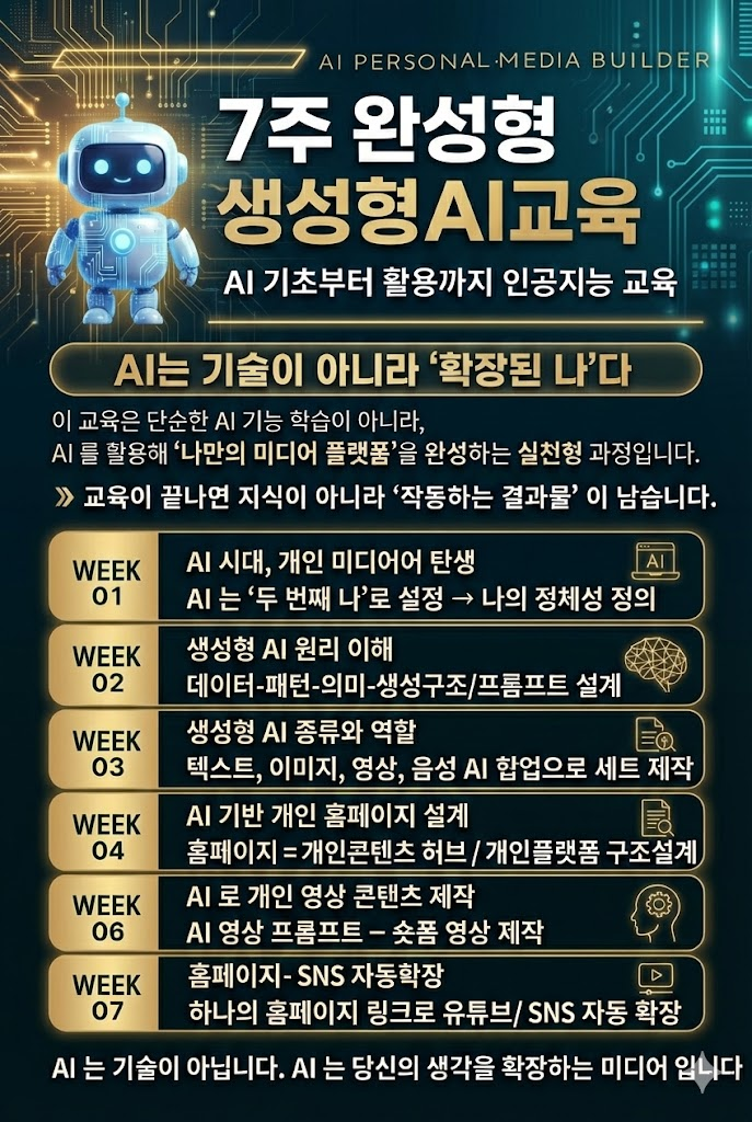 본 교육은 생성형 AI를 활용해 개인 미디어와 콘텐츠 플랫폼을 직접 완성하는 7주 집중 교육 과정입니다. AI의 기본 개념부터 의미 기반 생성형 AI 이해, 텍스트·이미지·영상·음성 AI 활용, 개인 홈페이지 구축, 유튜브·인스타 콘텐츠 확장까지 이론과 실습을 통해 실제 결과물을 만드는 것이 목표입니다.